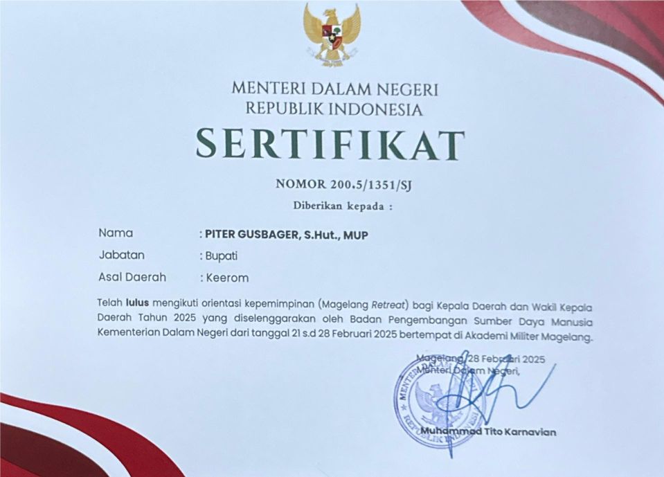 Papua.Utusanindo.Com.KEEROM,-Bupati Keerom, Piter Gusbager, S.Hut.MUP memberikan apresiasi kepada Presiden RI, Probowo Subianto setelah mengikuti kegiatan retret kepala daerah seluruh Indonesia di Magelang.