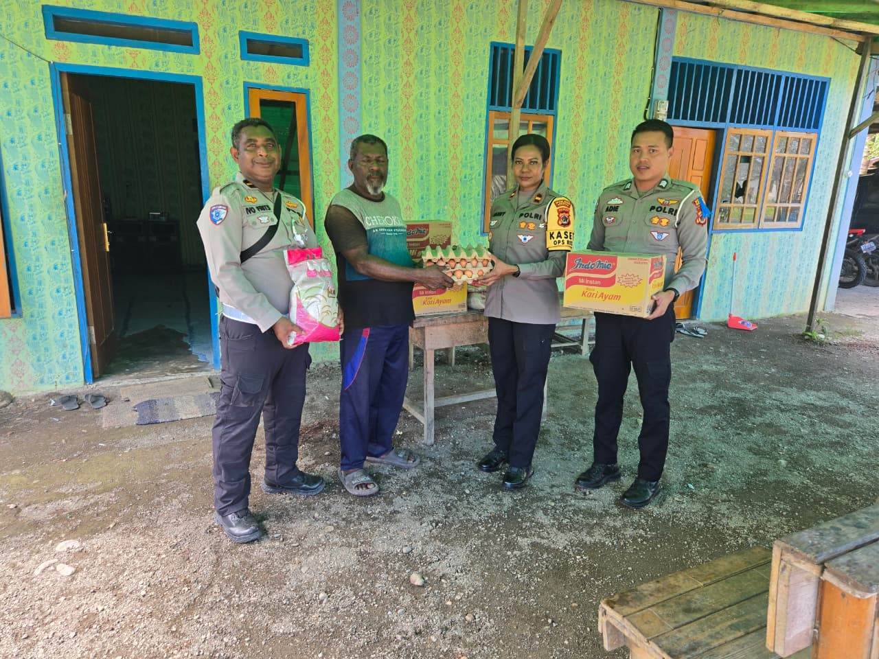Kasat Lantas beserta rombongan mendatangi rumah keluarga korban di Kampung Senggi untuk menyerahkan bantuan sembako dari Kapolres Keerom sebagai bentuk kepedulian institusi Polri. Bantuan diterima langsung oleh pihak keluarga dalam suasana penuh keharuan.
